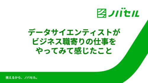 この記事は ノバセル Advent Calendar17日目です。 こんにちは。ノバセルでデータサイエンティストをしている松村です。 本記事では今年1年間の自分の仕事を振り返りつつ、分類としてはエンジニア職にあたる自分がビジネス色の強い業務をやってみた実感につ…