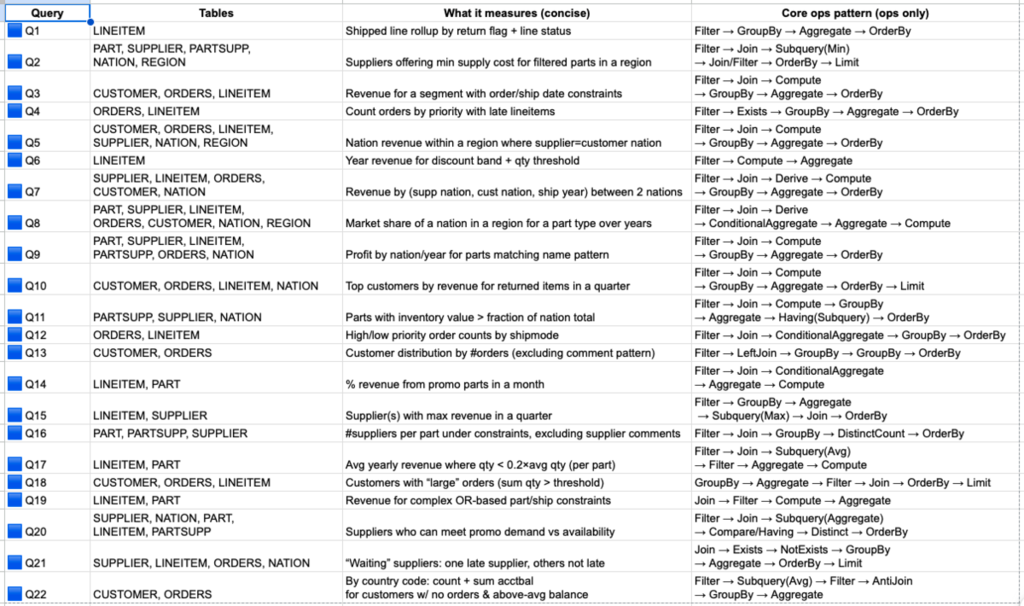 I use TPC-H–like queries because they represent realistic decision-support analytics, reliably stressing the operations that dominate laptop-scale workloads: multi-table joins, grouped aggregations, sorting/top-k, and selective filtering. The workload also scales naturally with the dataset scale factor (SF), making it easy to increase pressure on CPU, memory bandwidth, and execution strategy while keeping the schema and query semantics fixed.