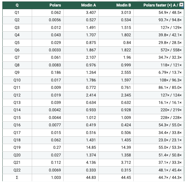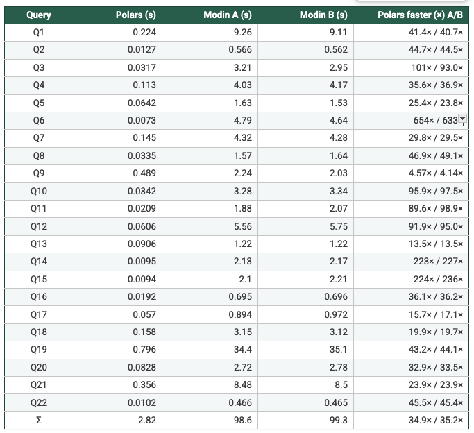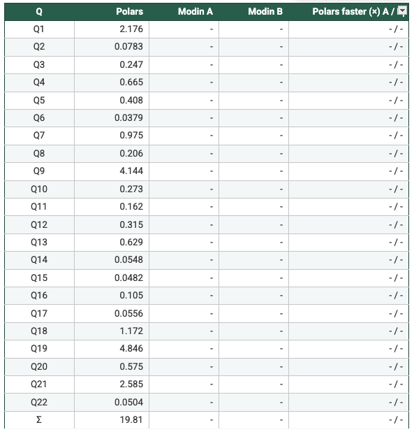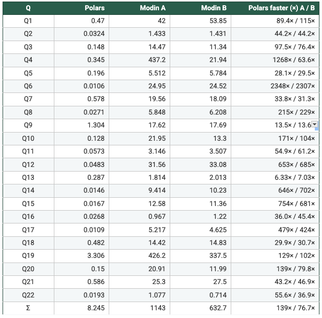 - Polars benefits from a native columnar execution engine and (optionally) lazy query planning, while Modin executes a pandas-compatible API on top of Ray. The benchmark therefore measures end-to-end systems (including orchestration and execution strategy), not only “parallelism knobs.”